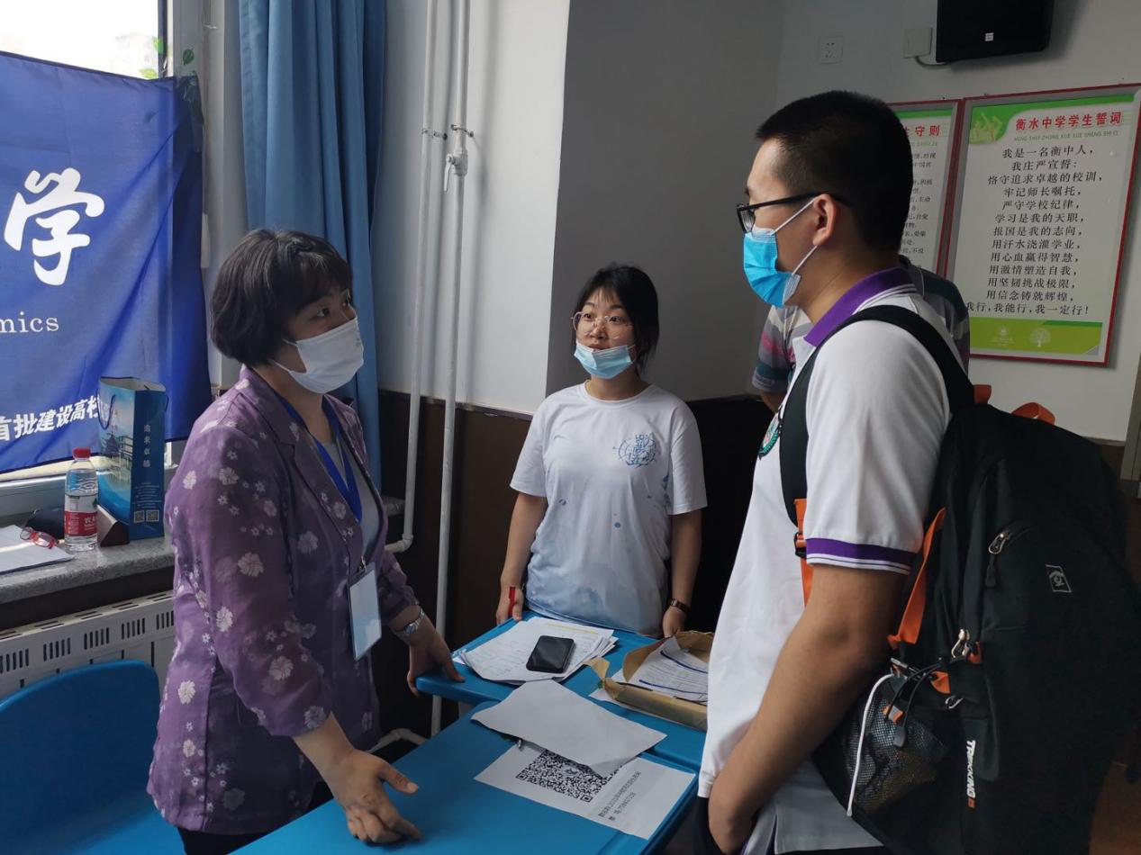 2021年6月25日,在衡水二中咨询现场,张琪副教授、董新义副教授和李孝文老师克服炎热天气,面对前来咨询的考生和家长,详细阐释和解答我校的专业学科背景、人才培养模式、近年高考录取情况、以及高考改革背景下的专业志愿录取规则等问题。
